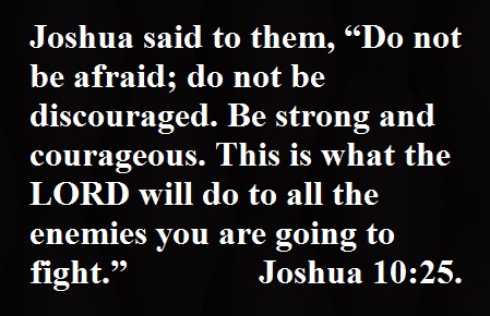 Joshua said to them, “Do not be afraid; do not be discouraged. Be strong and courageous. This is what the LORD will do to all the enemies you are going to fight.” Joshua 10:25.